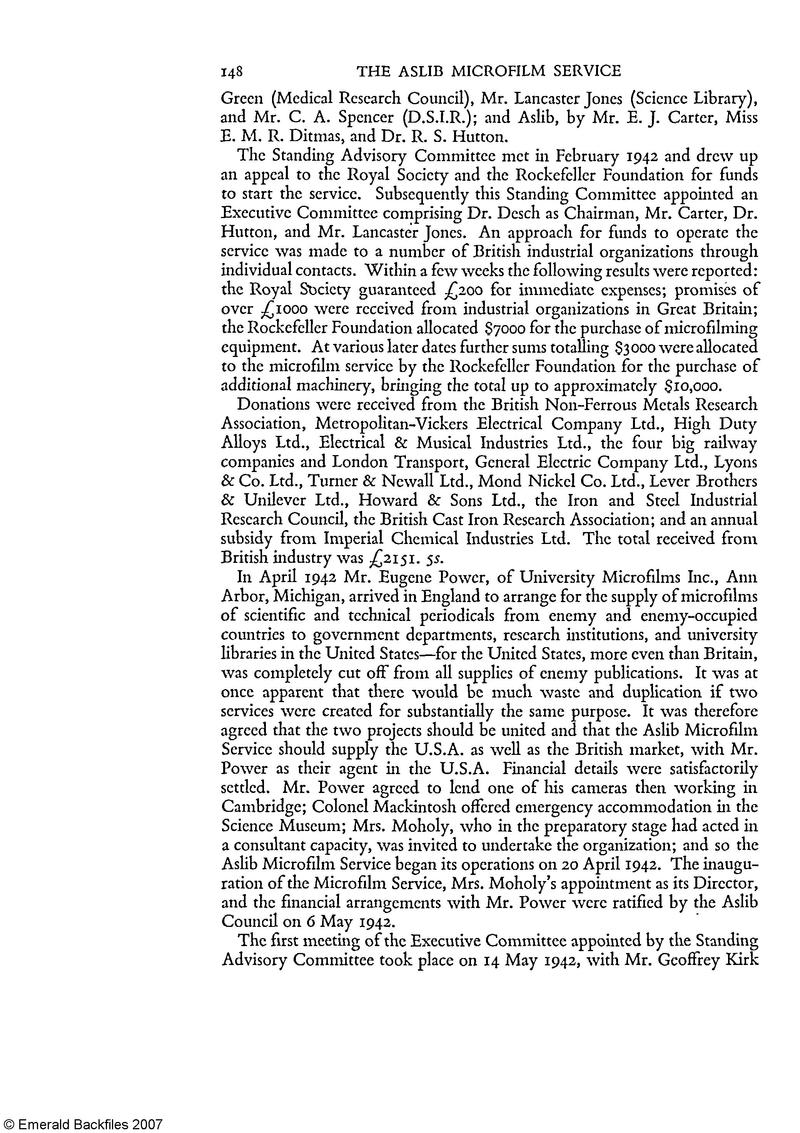 In April 1942 Mr. Eugene Power, of University Microfilms Inc., Ann Arbor, Michigan, arrived in England to arrange for the supply of microfilms of scientific and technical periodicals from enemy and enemy-occupied countries to government departments, research institutions, and university libraries in the United States—for the United States, more even than Britain, was completely cut off from all supplies of enemy publications. It was at once apparent that there would be much waste and duplication if two services were created for substantially the same purpose. It was therefore agreed that the two projects should be united and that the Aslib Microfilm Service should supply the U.S.A. as well as the British market, with Mr. Power as their agent in the U.S.A. Financial details were satisfactorily settled. Mr. Power agreed to lend one of his cameras then working in Cambridge; Colonel Mackintosh offered emergency accommodation in the Science Museum; Mrs. Moholy, who in the preparatory stage had acted in a consultant capacity, was invited to undertake the organization; and so the Aslib Microfilm Service began its operations on 20 April 1942. The inauguration of the Microfilm Service, Mrs. Moholy’s appointment as its Director, and the financial arrangements with Mr. Power were ratified by the Aslib Council on 6 May 1942.