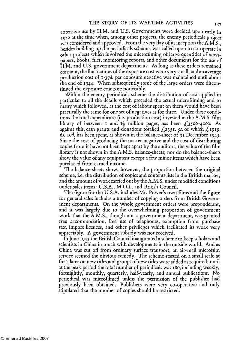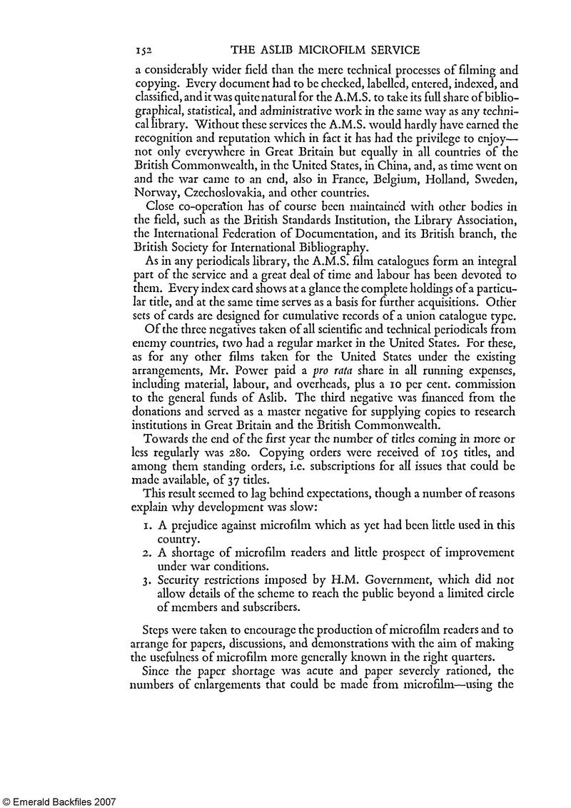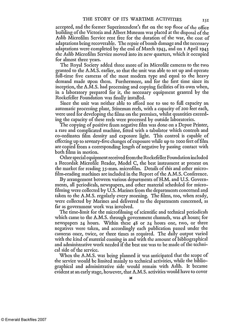 [p. 152] a considerably wider field than the mere technical processes of filming and copying. Every document had to be checked, labelled, entered, indexed, and classified, and it was quite natural for the A.M.S. to take its full share of bibliographical, statistical, and administrative work in the same way as any technical library. Without these services the A.M.S. would hardly have earned the recognition and reputation which in fact it has had the privilege to enjoy— not only everywhere in Great Britain but equally in all countries of the British Commonwealth, in the United States, in China, and, as time went on and the war came to an end, also in France, Belgium, Holland, Sweden, Norway, Czechoslovakia, and other countries.