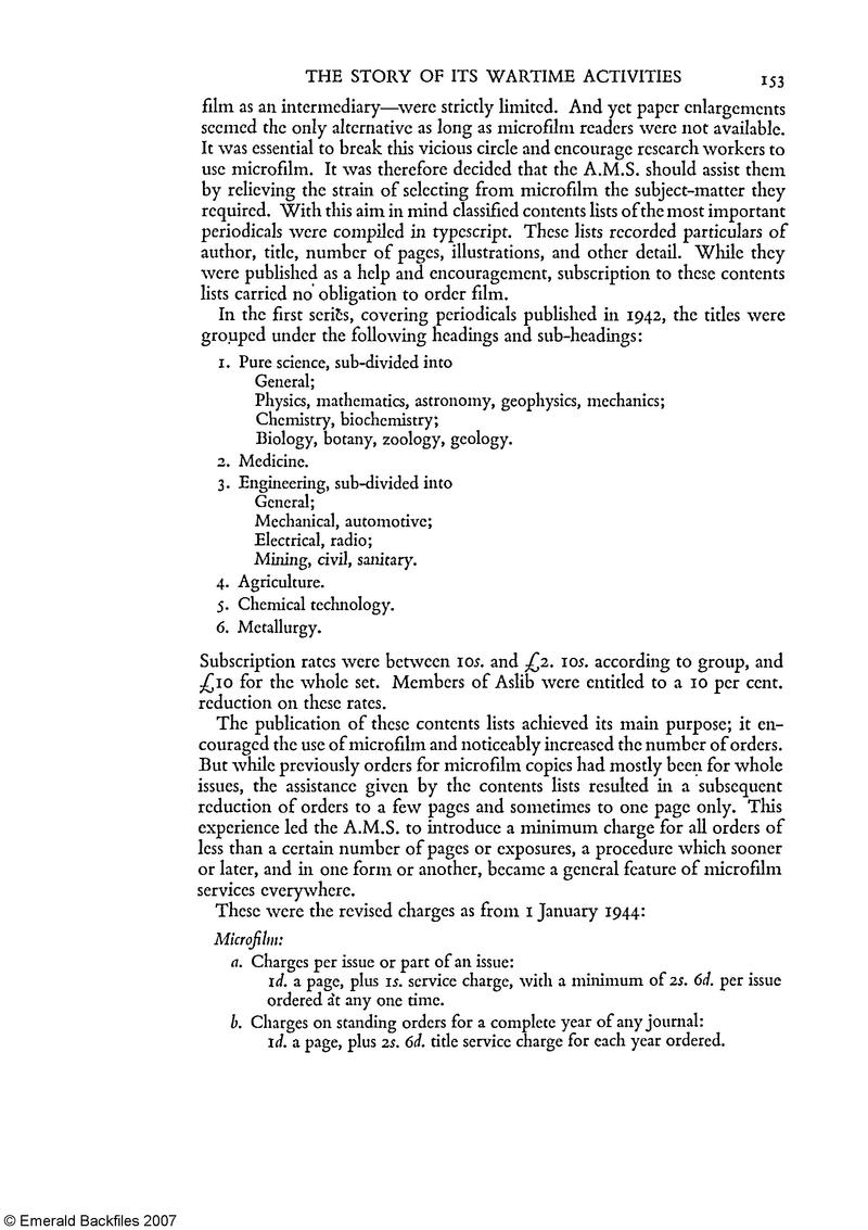 [p. 153] film as an intermediary—were strictly limited. And yet paper enlargements seemed the only alternative as long as microfilm readers were not available. It was essential to break this vicious circle and encourage research workers to use microfilm. It was therefore decided that the A.M.S. should assist them by relieving the strain of selecting from microfilm the subject-matter they required. With this aim in mind classified contents lists of the most important periodicals were compiled in typescript. These lists recorded particulars of author, title, number of pages, illustrations, and other detail. While they were published as a help and encouragement, subscription to these contents lists carried no obligation to order film.