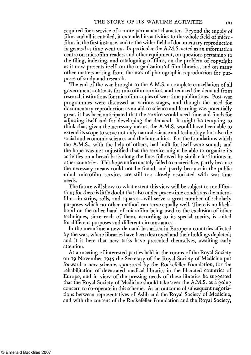 [p. 161] required for a service of a more permanent character. Beyond the supply of films and all it entailed, it extended its activities to the whole field of microfilms in the first instance, and to the wider field of documentary reproduction in general as time went on. In particular the A.M.S. acted as an information centre on microfilm readers and other equipment, on questions pertaining to the filing, indexing, and cataloguing of films, on the problem of copyright as it now presents itself, on the organization ‘of film libraries, and on many other matters arising from the uses of photographic reproduction for purposes of study and research.