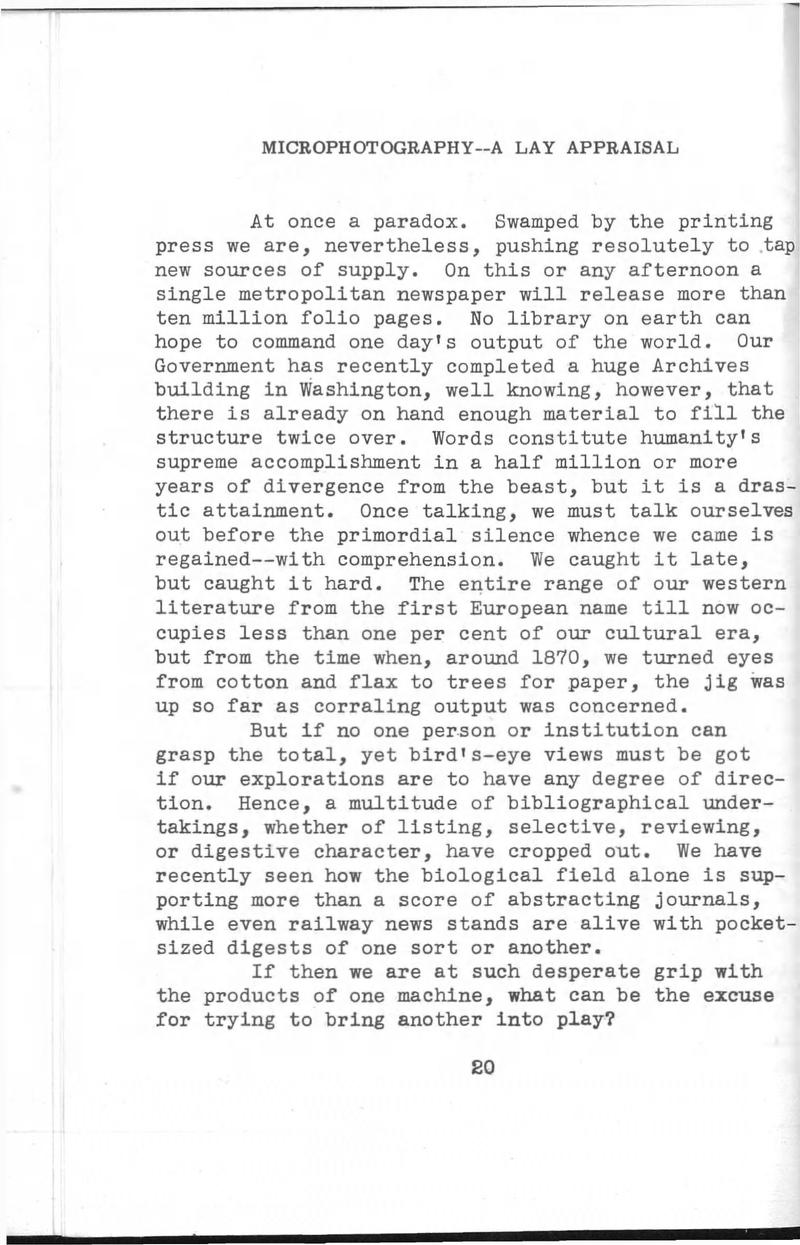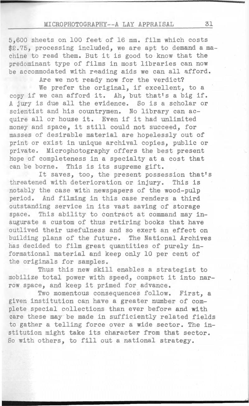 We prefer the original, if excellent, to a copy if we can afford it. Ah, but that’s a big if. A jury is due all the evidence. So is a scholar or scientist and his countrymen. No library can acquire all or house it. Even if it had unlimited money and space, it still could not succeed, for masses of desirable material are hopelessly out of print or exist in unique archival copies, public or private. Microphotography offers the best present hope of completeness in a specialty at a cost that can be borne. This is its supreme gift.