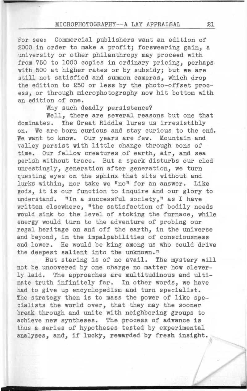[p. 21] For see: Commercial publishers want an edition of 2000 in order to make a profit; forswearing gain, a university or other philanthropy may proceed with from 750 to 1000 copies in ordinary pricing, perhaps with 500 at higher rates or by subsidy; but we are still not satisfied and summon cameras, which drop the edition to 250 or less by the photo-offset process, or through microphotography now hit bottom with an edition of one.
