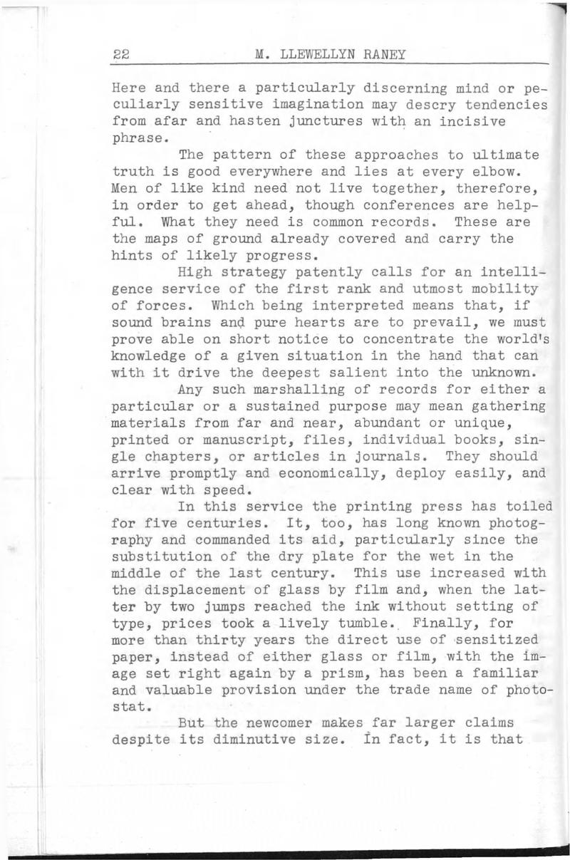 Any such marshalling of records for either a particular or a sustained purpose may mean gathering materials from far and near, abundant or unique, printed or manuscript, files, individual books, single chapters, or articles in journals. They should arrive promptly and economically, deploy easily, and clear with speed. In this service the printing press has toiled for five centuries. It, too, has long known photography and commanded its aid, particularly since the substitution of the dry plate for the wet in the middle of the last century. This use increased with the displacement of glass by film and, when the latter by two jumps reached the ink without setting of type, prices took a lively tumble. Finally, for more than thirty years the direct use of sensitized paper, instead of either glass or film, with the image set right again by a prism, has been a familiar and valuable provision under the trade name of photostat.