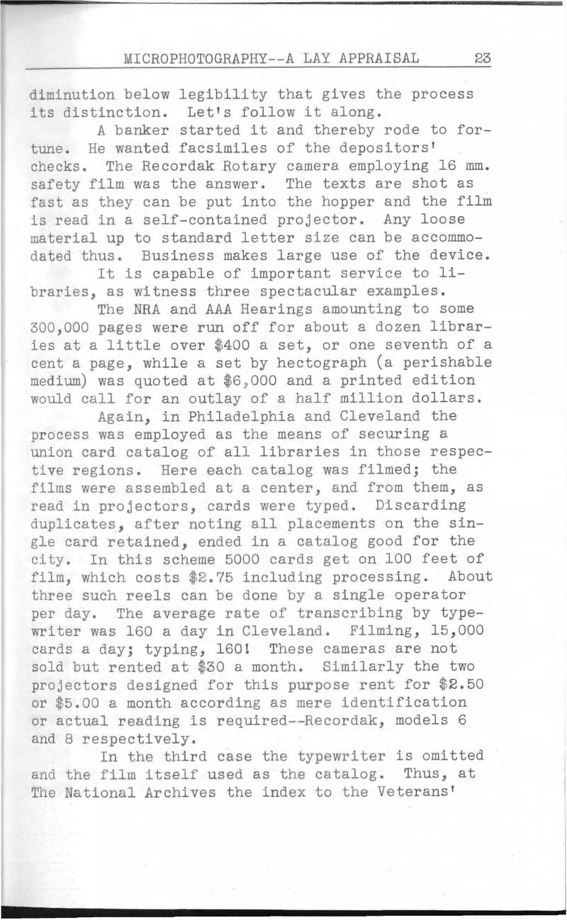 If, however, the new record is again not film but cards, stiff competition is at once encountered. The Philadelphia and Cleveland cases are odd owing to the availability of WPA labor. The films need not have been transcribed on cards by typists. Card prints could have been taken from the film, with greater accuracy certainly. The Folmer Graflex Corporation has recently worked out an estimate of about three cents a card for the combined filming and printing operations. Compare twenty typed cards an hour. But this photographic cost will certainly fall with the introduction of automatic action in enlargers through the contemplated addition of a film-advancing mechanism. Compare again the current