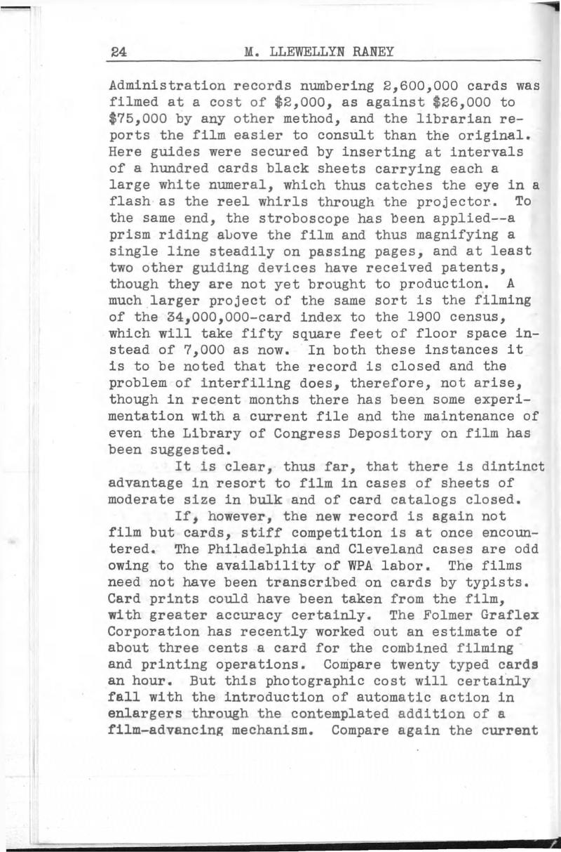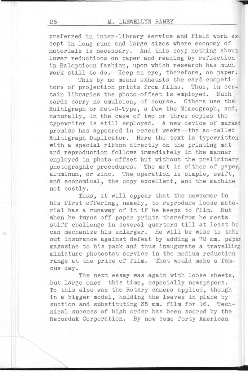 [p. 26] preferred in inter-library service and field work except in long runs and large sizes where economy of materials is necessary. And this says nothing about lower reductions on paper and reading by reflection in Balopticon fashion, upon which research has much work still to do. Keep an eye, therefore, on paper.