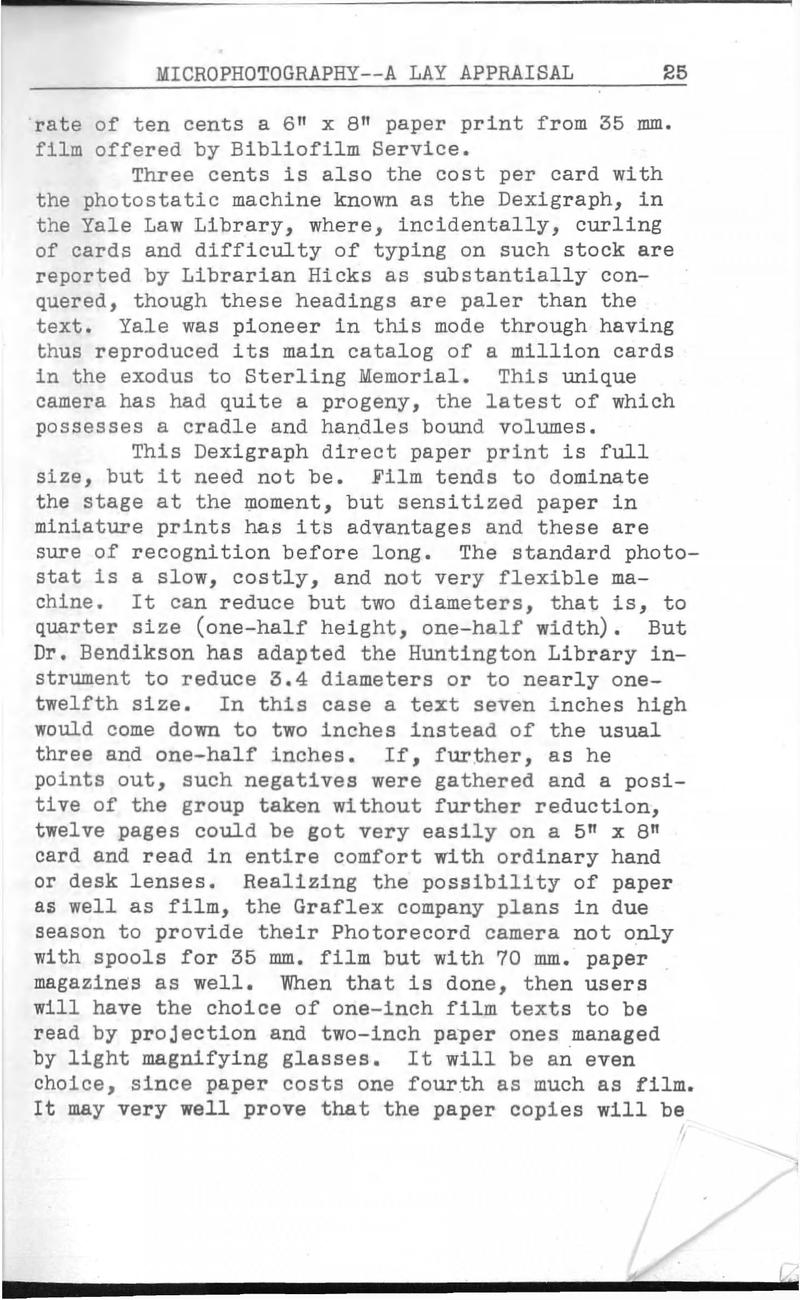 [p. 25] rate of ten cents a 6n x 8” paper print from 35 mm. film offered by Bibliofilm Service.