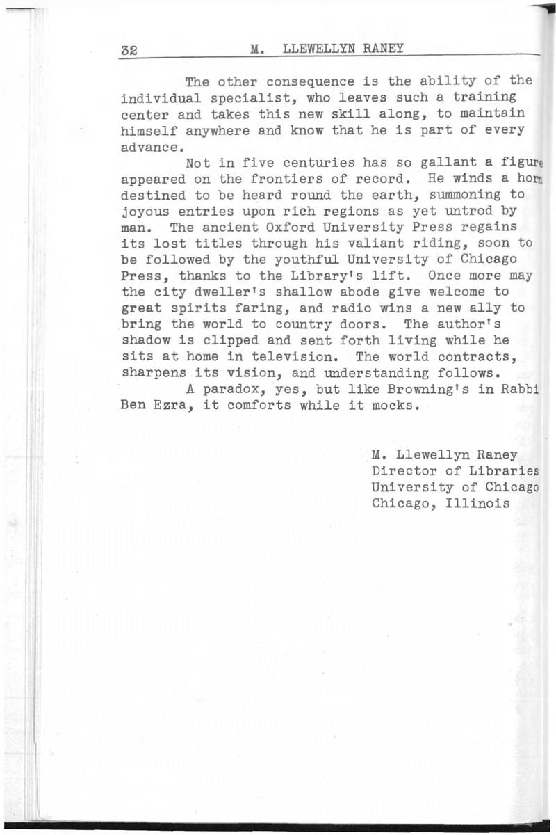 Not in five centuries has so gallant a figure appeared on the frontiers of record. He winds a horn destined to be heard round the earth, summoning to joyous entries upon rich regions as yet untrod by man. The ancient Oxford University Press regains its lost titles through his valiant riding, soon to be followed by the youthful University of Chicago Press, thanks to the Library’s lift. Once more may the city dweller’s shallow abode give welcome to great spirits faring, and radio wins a new ally to bring the world to country doors. The author’s shadow is clipped and sent forth living while he sits at home in television. The world contracts, sharpens its vision, and understanding follows.