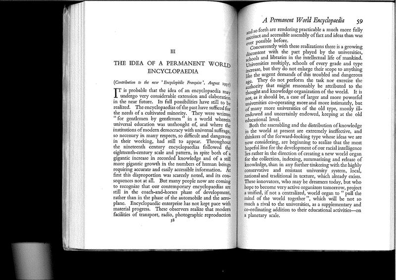 The phrase “Permanent World Encyclopaedia” conveys the gist of these ideas. As the core of such an institution would be a world synthesis of bibliography and documentation with the indexed archives of the world. A great number of workers would be engaged perpetually in perfecting this index of human knowledge and keeping it up to date. Concurrently, the resources of micro-photography, as yet only in their infancy, will be creating a concentrated visual record.