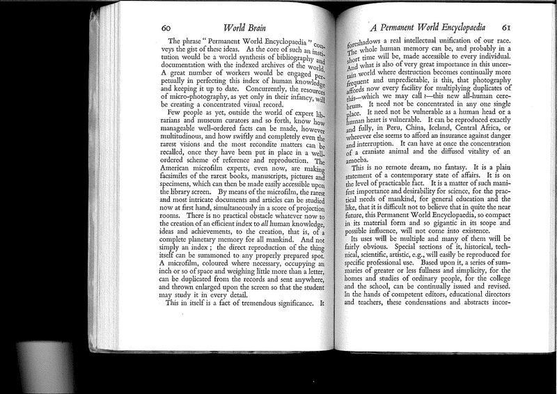 This is no remote dream, no fantasy. It is a plain statement of a contemporary state of affairs. It is on the level of practicable fact. It is a matter of such manifest importance and desirability for science, for the practical needs of mankind, for general education and the like, that it is difficult not to believe that in quite the near future, this Permanent World Encyclopaedia, so compact in its material form and so gigantic in its scope and possible influence, will not come into existence.